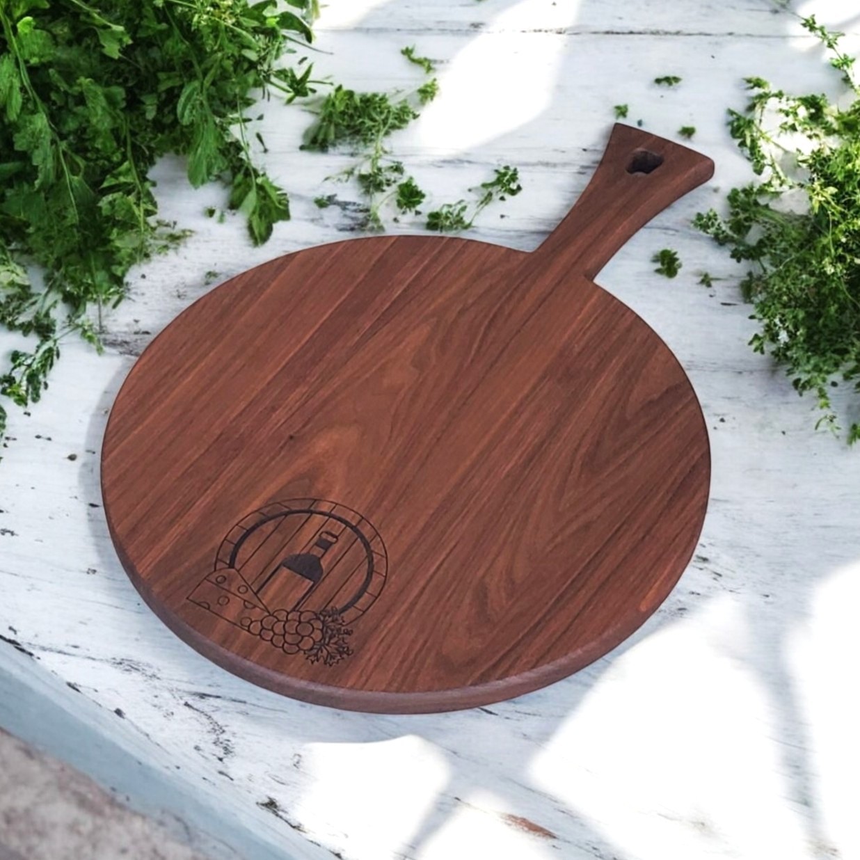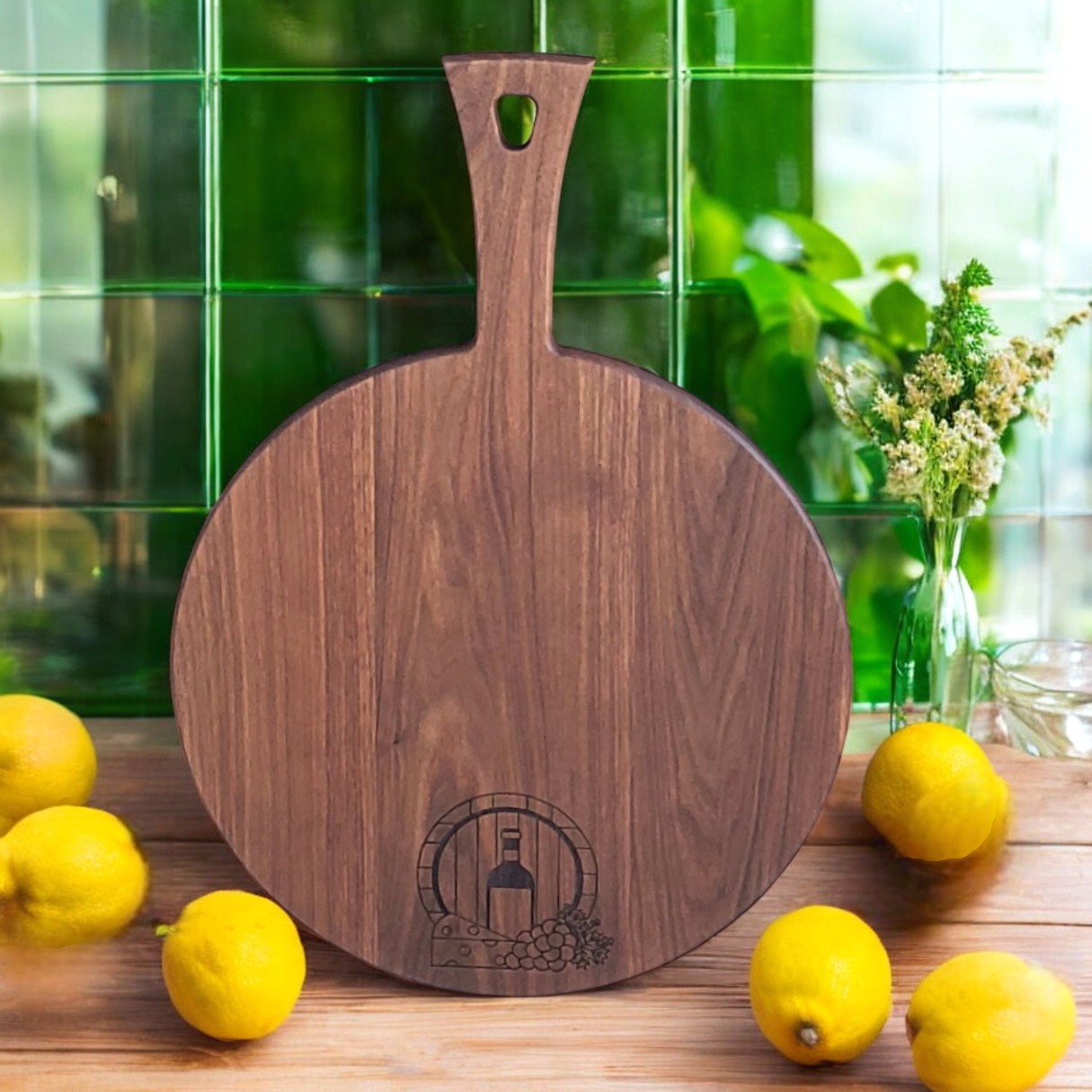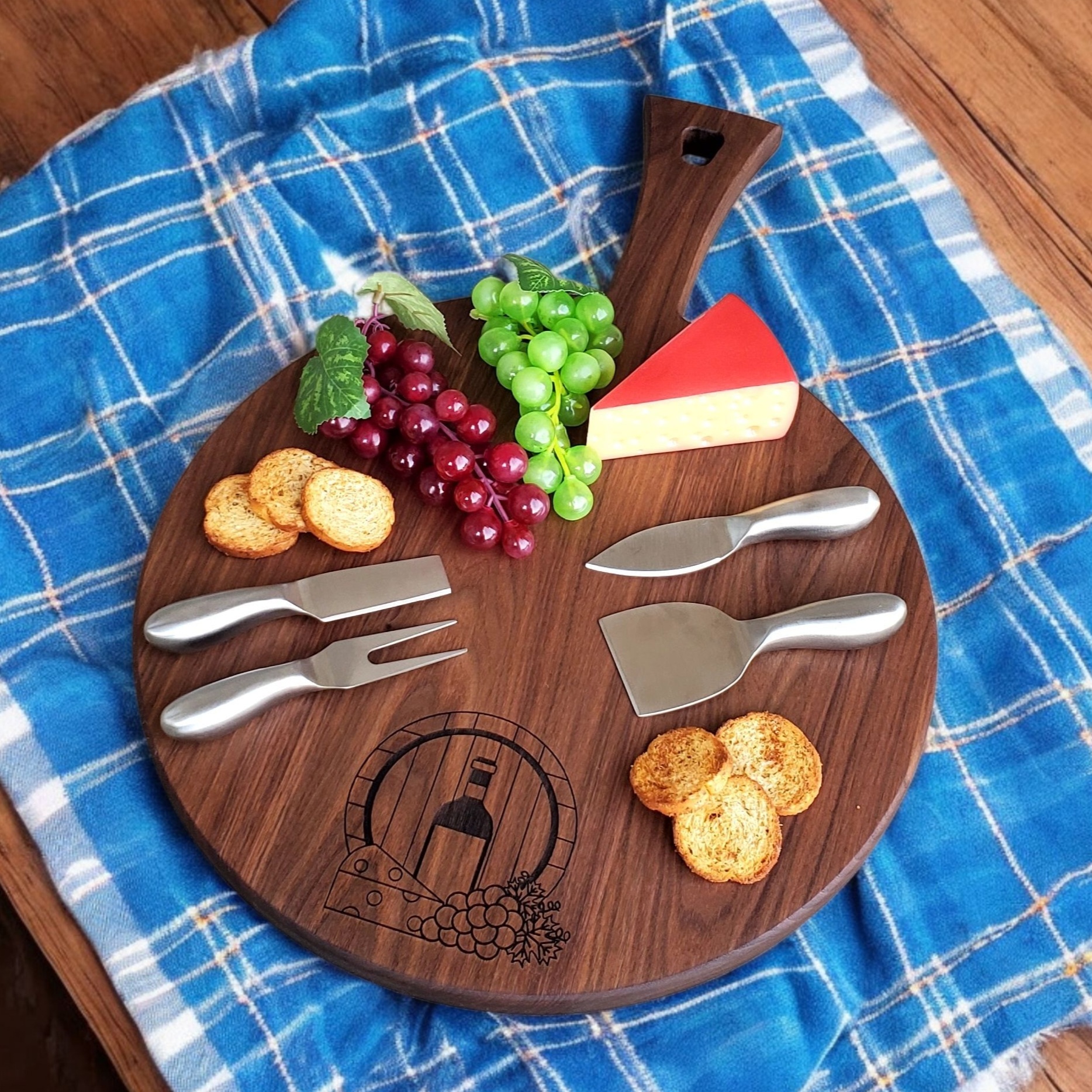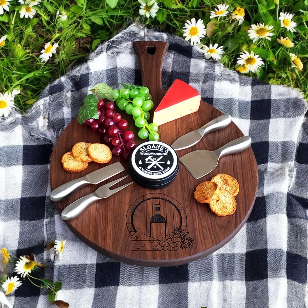 Round Charcuterie Boards! Beautifully personalized, made from rich walnut wood, and designed with a convenient handle for easy serving and hanging. Add cheese knives and wood conditioner to make it a complete set!